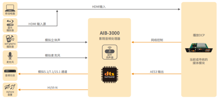 AIB-3000是一款独立运行的16通道影院音频处理器,可兼容当前市面主流及传统的DCI服务器,支持5.1/7.1音频格式以及多达16通道的音频处理。DTS Surround Cinema环景音官方认证的影厅通过精确的声音系统校准,并利用带有增强型低音管理功能的全频环绕扬声器系统,呈现震撼的环绕声体验。