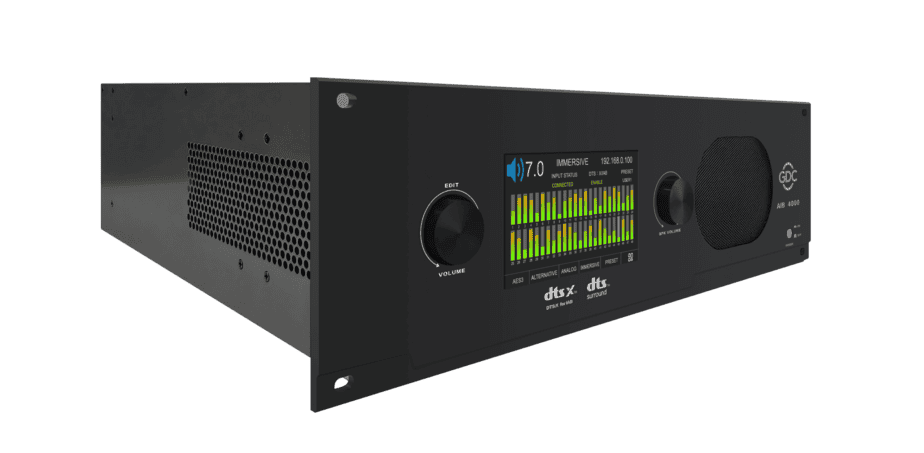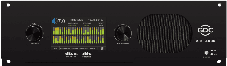 Native support for DTS:X for IAB immersive audio playback (compliant with SMPTE ST2098-2 standard) is provided, with full compatibility for Dante and AES67 protocols that enable 64-channel network audio interface.